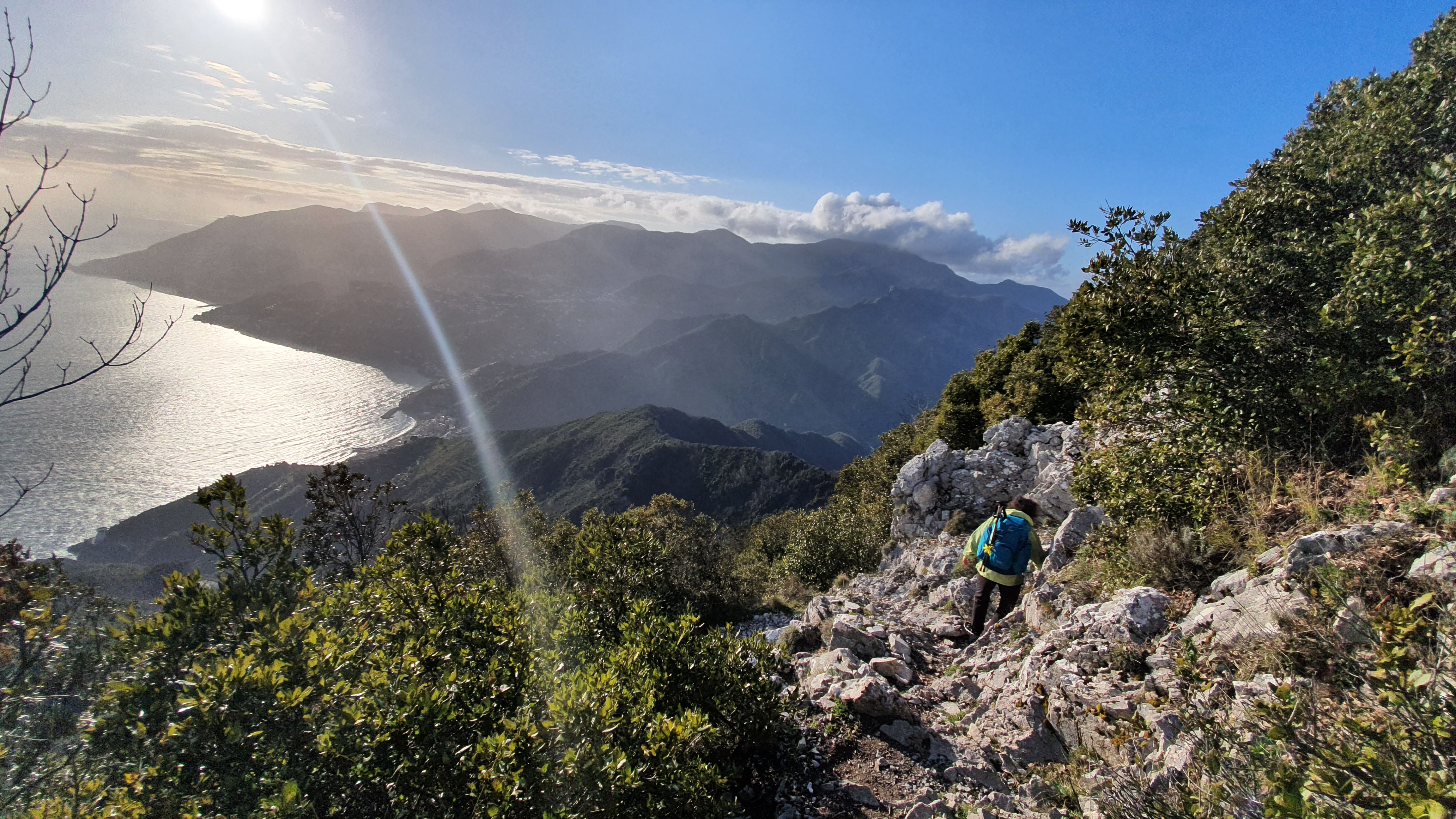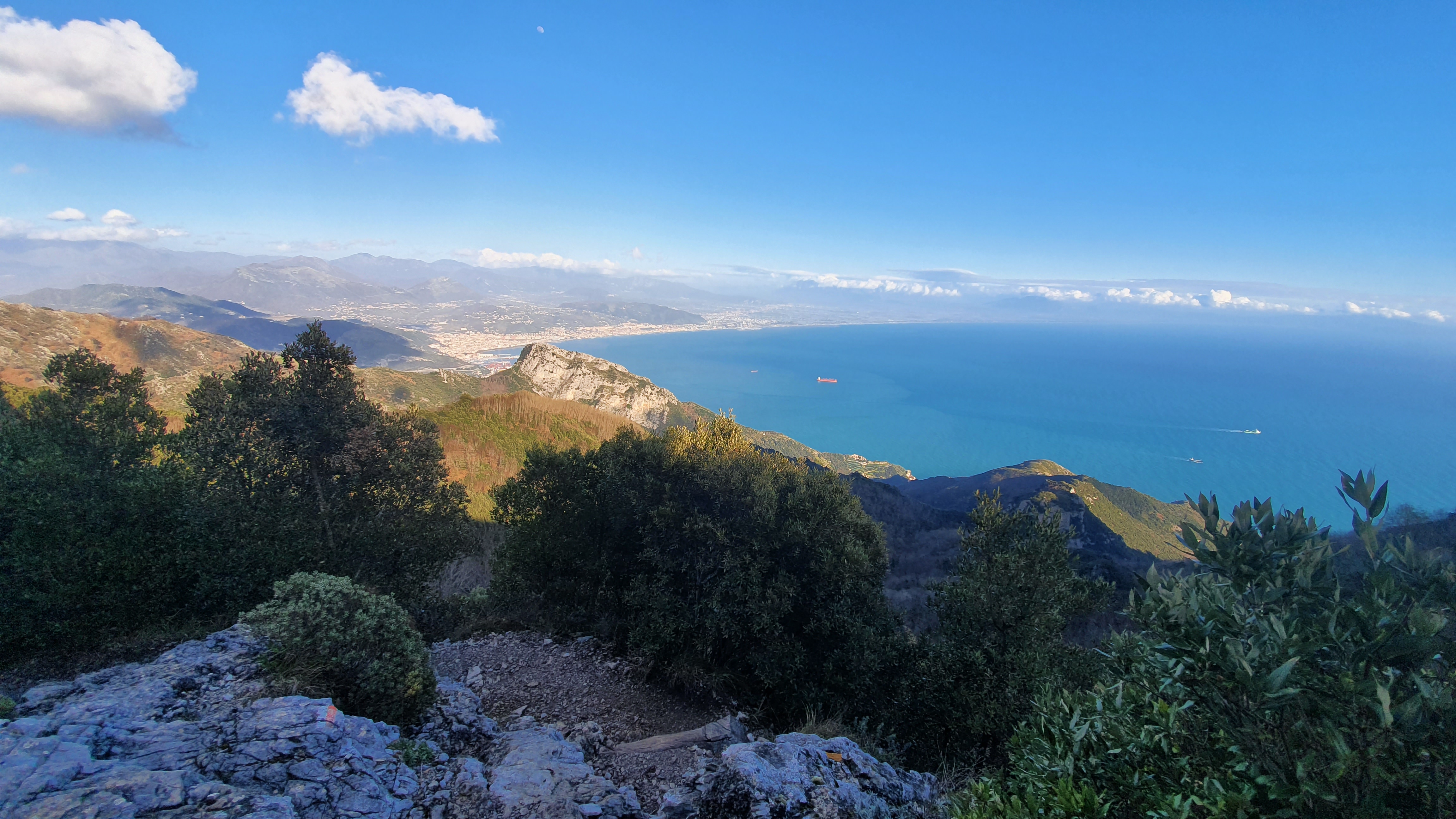 Nach ca. 3-4 km erreichten wir den ersehnten Gipfel. Jubel wurde ausgestoßen und die Augen wurden groß als wie das unglaublich Panorama betrachteten. Hinter uns lag Salerno, das Meer und am Horizont lag eine Bergkette. Vor uns ein abfälliger Wanderweg, ein großer steiniger Berg und ein Tal das ins blaue Meer mündet.